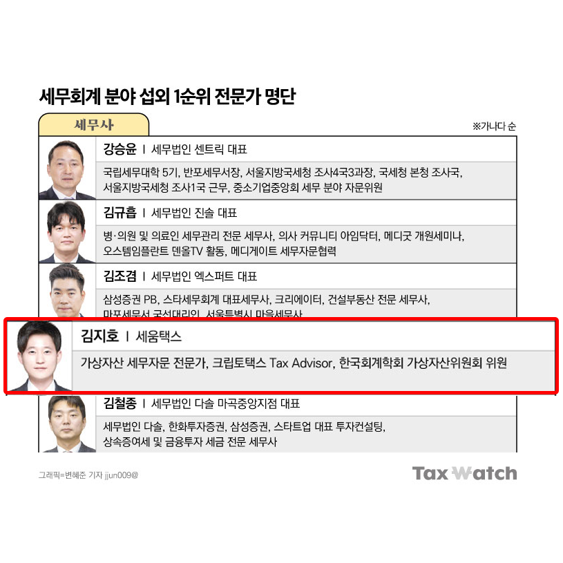 세움 택스(이하 ‘SEUM Tax’)의 김지호 세무사가 2026년 1월 30일(금), 택스워치가 뽑은 ‘2026년 최고의 TAX 전문가 50인’에 가상자산 분야 전문 세무사로 선정되었습니다.